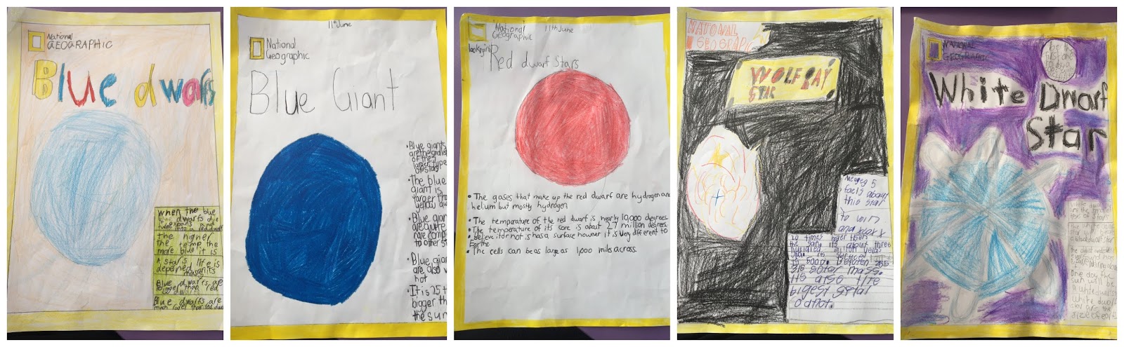 As part of our 'what's out there?' unit, we did some learning about different kinds of stars. To display this learning, we created our own National Geographic Magazine covers.